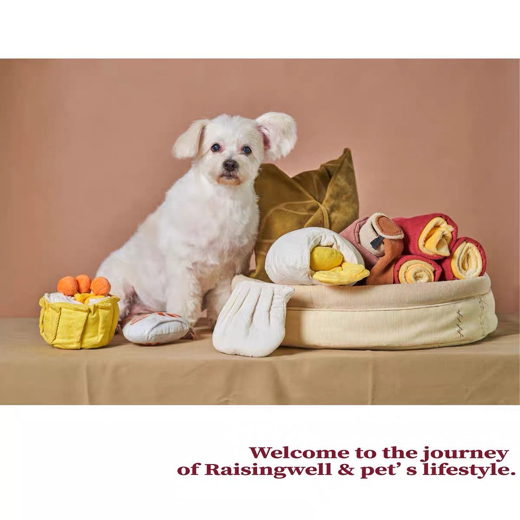 The Custard Bun snuffle toy is designed with crinkly paper to capture your pet's interest and features a half-pocket for hiding treats. Inside, the stuffing includes a sound toy for extra engagement, and treats can be placed in the sandbag for sniffing fun.